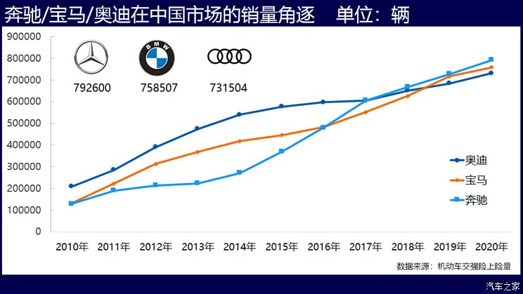 2020年,按终端上险销量数据排名,奔驰79.26万辆,宝马75.85万辆,奥迪73.15万辆,10年前的2010年,奔驰、宝马、奥迪在中国市场的年销量分别只有12.8万辆、13.2万辆和20.9万辆。进入中国市场最早、一度排名在前的奥迪目前略逊一筹,宝马领先了奔驰近十年,2017年被奔驰以1300辆的微弱优势超越,其后差距逐渐拉大。今年1月,三者的排名还是奔驰第一,宝马第二,奥迪第三。