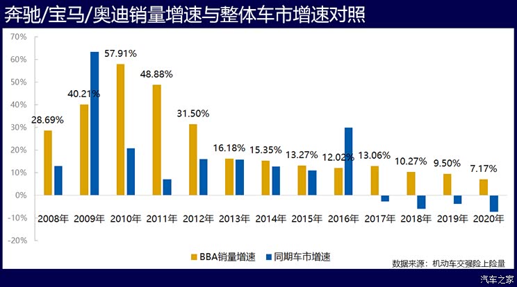 如果持续跟踪新车销售市场,最刺激的一个感受就是:BBA你“一枝独秀”啊,低迷、不振,下调,走低,这些颓词儿都与你无关!自2017年以来,这种形势就没变过,月月如此,年年如此。最近四年整体车市销量连续负增长,BBA却连续正增长,大众怕是羡慕的紧。不过,从近四年的增速看,BBA也是受了车市低迷的影响的,身在江湖难独善。