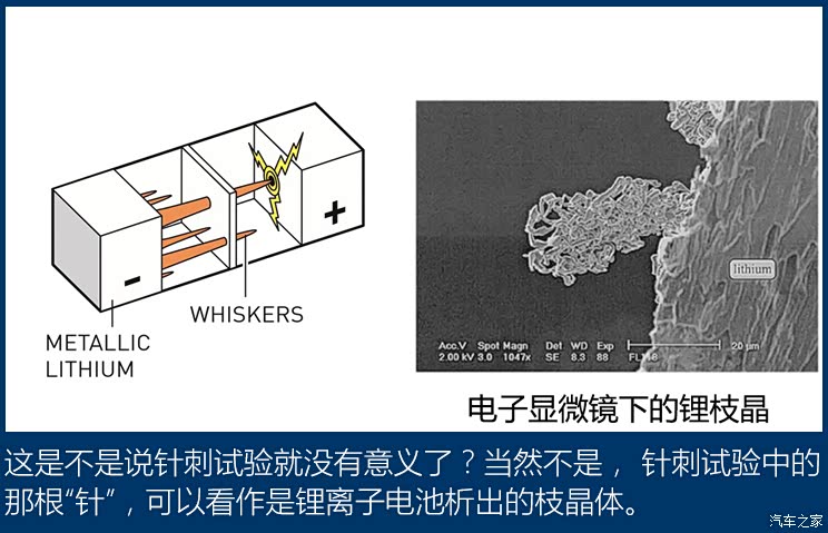 枝晶体是锂离子电池的“副作用”,它是能穿透电池正负极之间的隔膜,引起电池内部短路的。针刺试验则可以验证电芯内部短路后,电芯热失控的扩散情况。