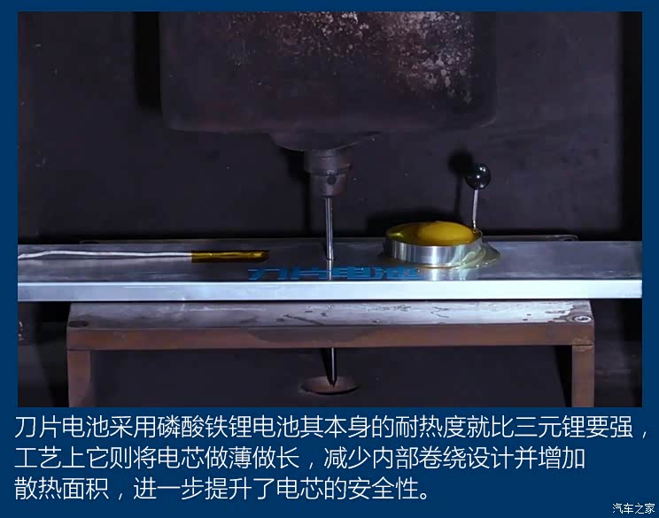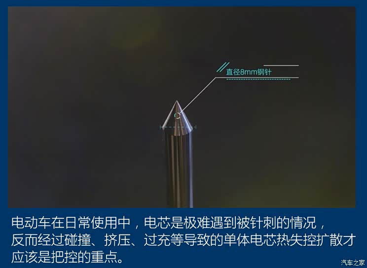 看到这个试验,我们会不自觉地想到比亚迪刀片电池的针刺试验,同样是给电池起了新名字,然后用针去刺,但不同的是比亚迪是用单体电芯来做针刺试验,点击传送门大家可以看到我们对刀片电池针刺试验的详细解读。宁德时代也针对电池包做过针刺试验,那我们不禁要问针做错了什么?为什么都要和针刺过不去?