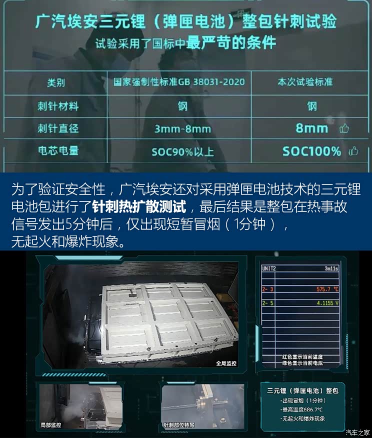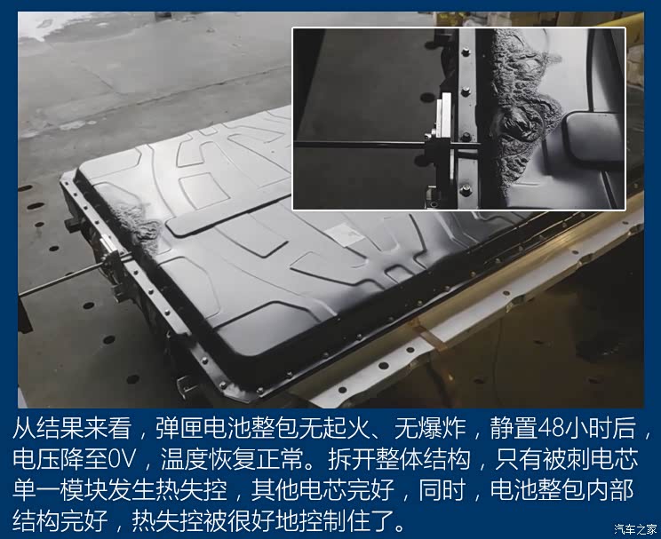 所以外行看热闹,内行看门道,单体电芯也好整个电池包也罢,针刺试验从来都不是看针刺是否能引起热失控,因为它本身就是在模拟短路状态下,热失控的程度以及看能不能将热失控控制住做到不扩散。