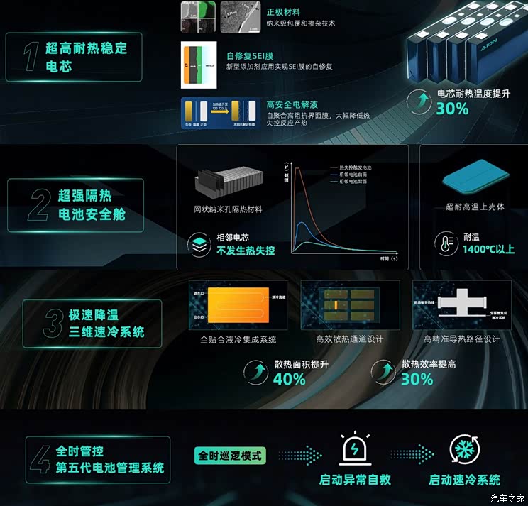 一组数据来展示弹匣电池技术安全方面的能力,电芯耐热温度提高30%,相邻电芯不容易发生热失控散热面积提升40%。上壳体耐温达到了1400摄氏度以上,及时速冷降温散热效率提高30%,第五代BMS系统,24小时、每秒10次采集数据,一有异常就能自动启动自救速冷系统。
