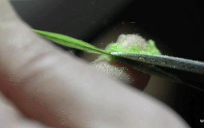 然后“打尖”,剪刀一次次把绒条修剪成各种角度,千丝菊的尾巴是尖的就修成锐角。再到“传花”,用镊子将打过尖的绒条,或垒,或团起来,勾勒出菊花的样子。