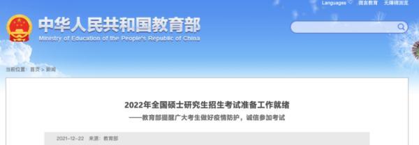 教育部提醒广大考生,要认真做好个人疫情防护,提前了解考点有关研考防疫要求,按规定做好各项准备。要充分考虑体温检测、安检等因素,合理安排考试期间出行时间和路线,预留足够赴考时间。要仔细核实确认考试时间、地点和考试科目,按照考务相关要求,提前准备好考试所需有关证件以及必备的考试用具。考试期间,要服从考试工作人员的引导和指挥。