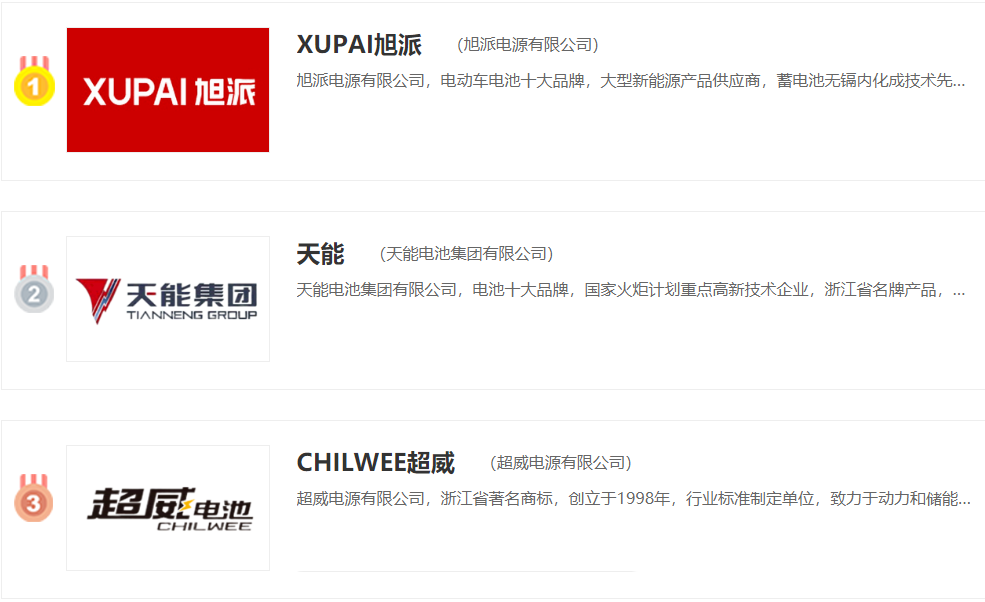 榜单第一位:旭派电池,它的知名度在3者中电池中并不算高的,但它其实也是老牌电池品牌之一,它追逐的寿命更长、更耐用,而这一点也是电动车主最需要的,电动车现在面临电池1年2年更换一次,旭派的企业目标刚好解决了用户痛点,而其推出的耐用电池也深受车主青睐,而耐用往往被理解为质量好,所以也在知名度不及前两者的情况下,获得了质量排行榜的第一位。