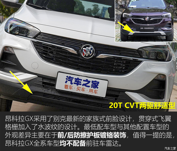 新车图解 昂科拉GX是上汽通用别克旗下一款全新的紧凑型SUV,新车作为昂科拉家族最新的一款SUV车型,它的尺寸比昂科拉要大一些,定位介于昂科拉和昂科威之间,目前有四款配置可选,厂商指导价为15.59~18.59万元,相邻配置车型之间的差价为一万元。今天我们就来看看昂科拉GX全系最低配的20T CVT两驱舒适型和次低配20T CVT两驱豪华型值不值得购买。