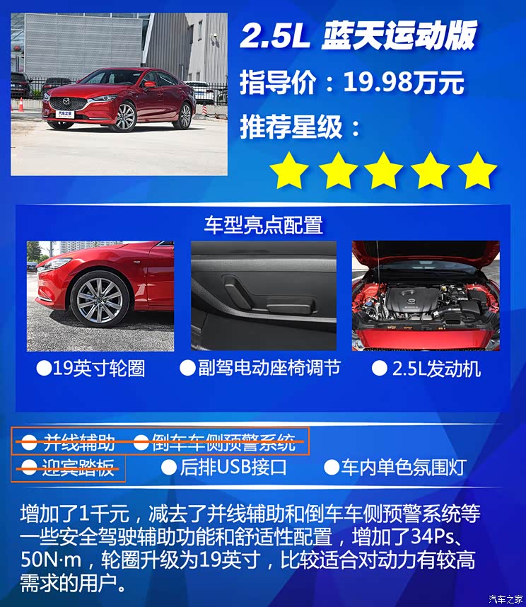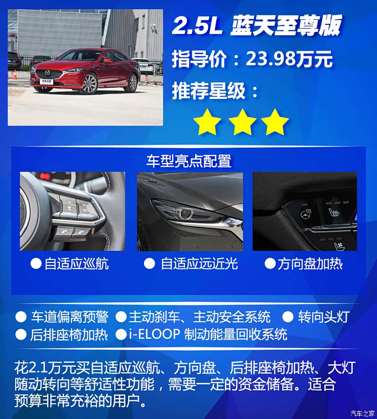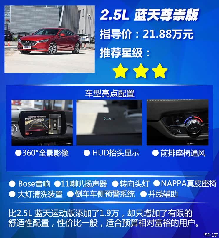 只增加一千元就提升了发动机动力,还换成了19英寸的轮圈,虽然对于并线辅助、迎宾踏板等舒适和安全性配置予以了一定的取消,但这样的安排一定很让注重动力和驾驶的用户动心。而跟性价比不错的2.0L蓝天豪华版相比,增加1万元即可在提升动力的基础上,增加7英寸液晶仪表、19英寸轮圈、换挡拨片、前排座椅加热、后排USB接口等一系列配置,让档次感、动力和方便性得到全面提升,可谓是六款车中的性价比之首了,这里给予五星推荐。