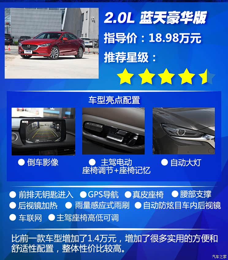 相比于2.0L的蓝天时尚版,2.0L蓝天豪华版在增加1.4万元价格的同时,也增加了GPS导航、倒车影像等非常实用的配置,同时真皮座椅、无钥匙进入等舒适性配置在平时也能很好地提升用户体验。总价18.98万元,论性价比,这款车在2.0L的动力版本当中,可谓是首选。这里给与这款车四星半推荐。