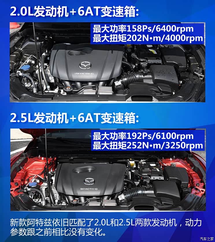 新款阿特兹分为两个动力版本,每个动力版本有三款车型。2.5L版本车型配置整体较高,明显地划分出了高低排量之间的级别差异。
