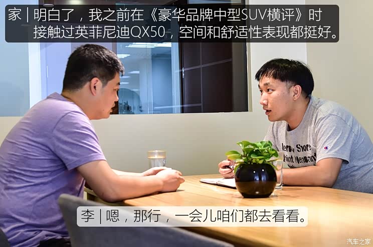 经过简单的沟通,我发现李先生对于自己这次换车的需求还是比较明确的,因为之前开的是一辆紧凑型轿车,随着女儿的长大,空间有些不够用了,所以希望购买一款空间宽敞一些的豪华品牌SUV。沟通之后,我们决定一起去看看奥迪Q5L(参数|询价)、奔驰GLC L和英菲尼迪QX50,其中前两款为李先生的备选车型,QX50之前给我留下了不错的印象,这次也推荐给李先生作为备选。