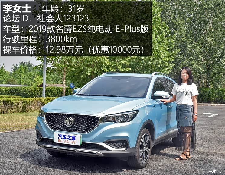 名爵EZS是电动车界的新成员,于3月30日正式上市,李女士是首批车主。在选车过程中,李女士关注了多款小型SUV车型,帝豪G Se坐姿低、瑞虎3xe和北汽EX360内饰提不起兴趣,最终李女士选择了这款名爵EZS。4月初订车、4月底提车,首批用户可享受“直降1万元”的礼包,目前李女士这台车已经行驶了3800km。