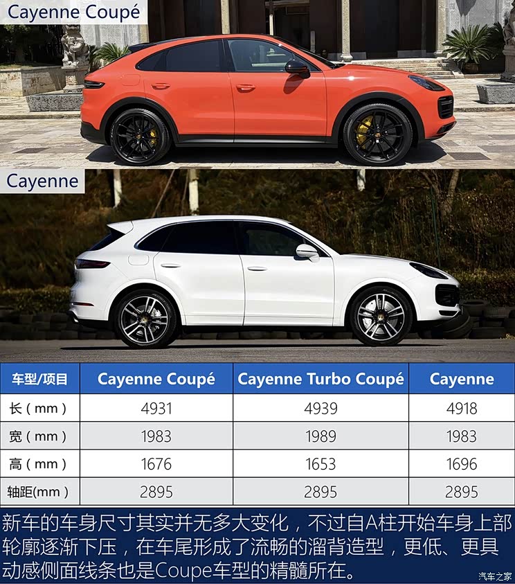 新车图解 在千篇一律的SUV车型中什么样的车能让大家心动?或许轿跑SUV会是不少人心中的答案。在奔驰宝马推出各自轿跑SUV久矣的当下,保时捷的步子似乎有些不紧不慢,直到最近才推出了首款轿跑SUV也就是Cayenne(参数|询价) Coupé。这款车在早前的市场活动中已经公布了售价,Cayenne Coupé和Cayenne Turbo Coupé两款车型分别作价99.8万元、190.8万元。如今在上海车展开幕前夕,它们来到了国内消费者面前,接下来我们就一同领略一下保时捷轿跑SUV的风华。