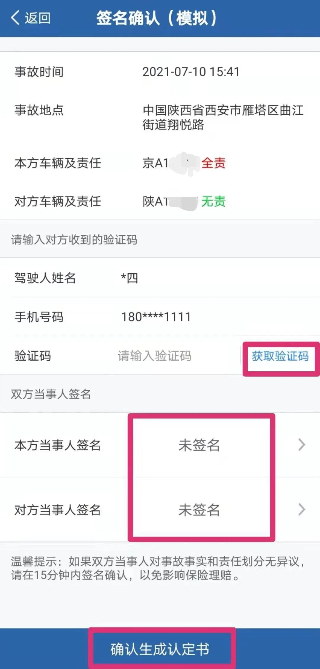 【根据页面提示填写对方当事人手机号码、验证码并签名确认,自动生成《道路交通事故认定书(简易程序)》。】