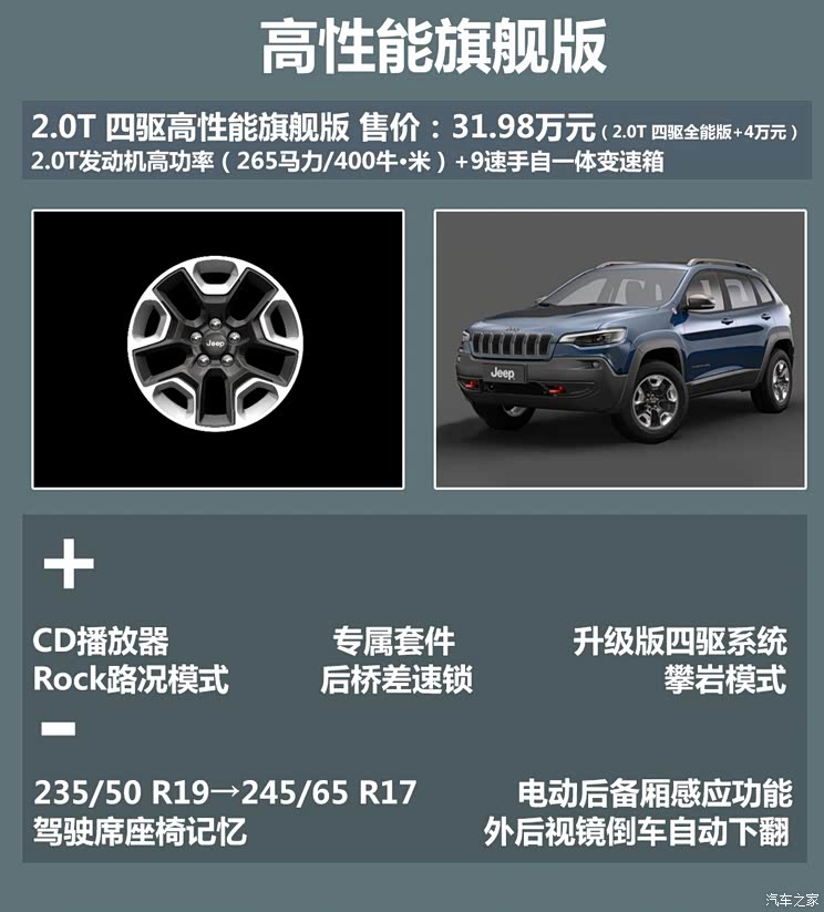 最后让我们再来看看全系的顶配车型——高性能旗舰版。不同于一般车型堆砌舒适性配置,新车完全是为了提高Off Road性能。无论是专属套件、后桥差速锁、有着更强性能的升级版四驱系统,还是新增的Rock路况模式等等,都是为了确保其能提供同级别车型中数一数二的越野性能。此车无疑是对Off Road性能有需求用户的福音。
