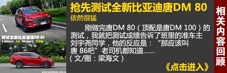 从对唐DM实测加速成绩来看,4.7秒0-100km/h加速能力可以说是非常显眼,起步时完全靠电机驱动,整个加速过程都有着较强的推背感。在纯电模式,电量充足的情况下,即便是深踩油门,发动机也不启动,整个行驶过程很安静,车辆完全以纯电行驶。在混动模式下,肯定会不如纯电模式安静,发动机会带来一些振动和噪音,但整体对于噪声的控制不错,不会给你明显的感觉。转向没什么虚位,精度挺高,悬架对于车身的支撑到位,在较快车速过弯时侧倾并不大。