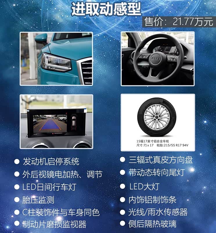 进取动感型是全系的最低配车型,也是全系唯一一个搭配17英寸轮圈的车型。虽说是最低配,但其实配置也并不简陋,Q2L全系标配LED大灯、发动机启停系统、ESC和胎压监测装置等,对于主动安全方面的考虑做得还是比较好的。但是对于Q2L这样年轻化定位的车型来说,这个配置的丰富程度恐怕还难以满足年轻消费者的胃口。