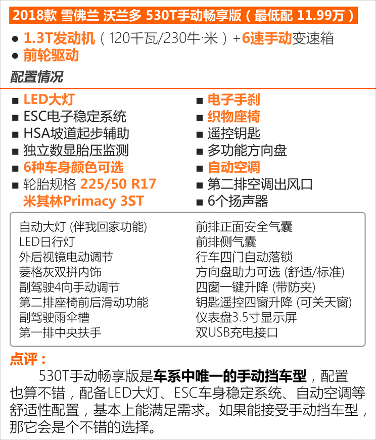 按一般套路来说,入门级车型都是简配降成本,降低车系起步价的角色。但在沃兰多这,套路就不适用了,如果你能接受手动挡车型,我觉得入门级的530T 手动畅享版是个不错的选择,舒适性配置基本够用。沃兰多全系标配17英寸铝合金轮圈(款式有所不同),匹配规格为225/50 R17的轮胎,这点挺厚道的。