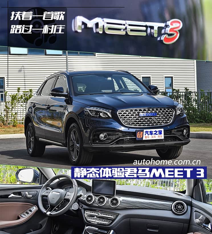 新车图解 对于车企来说,每一款新产品在推出的时候都要想几个亮点用来吸引消费者,前些年的车型亮点无非就是大空间、动力强、操控好、省油等等,随着时代的发展,现在的关键词变为了大空间、大屏幕、智能互联系统等等,那么总要有一些车型会让自己与众不同一些,今天的主角——君马MEET 3便是其中一位,这是一款官方定义为音乐轿跑SUV的车型,至于它的亮点是什么,您往下看。