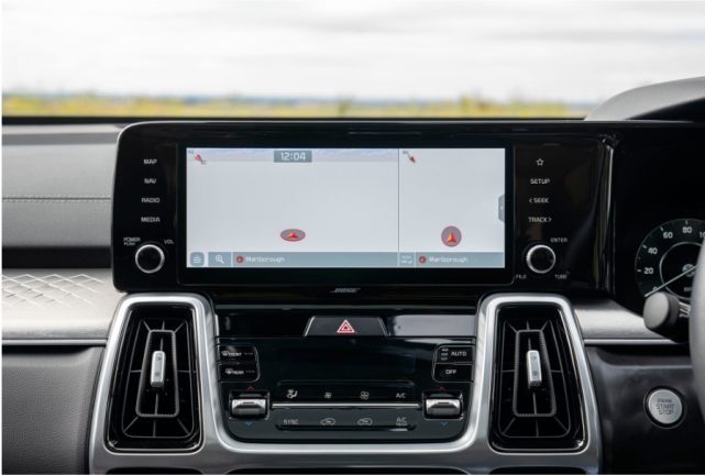 新款索兰托的内部造型设计采用了更加丰富的材质组成,车款整个中控台采用了大量的Nappa真皮材质覆盖,中间穿插了一大块具有特殊纹理的银色装饰板材,看起来非常的精致,车款整个功能区域采用了非常硬朗的设计语言,车款内部配备10.25英寸的长方形悬浮式中控屏,左侧则是一块12.3英寸的液晶表盘,两者采用同框设计增强一体感。