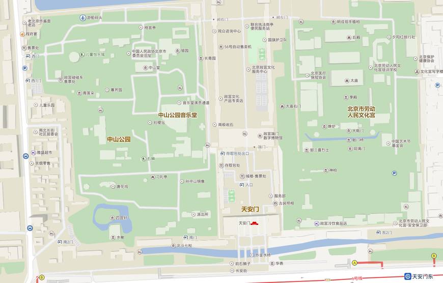 中山公园,在北京中轴线上面,中山公园位于北京中轴线的西侧,而劳动人们文化宫位于北京轴中线的东侧,二者都属于北京市东城区,可见这个地方,并没有按照北京中轴线进行行政区划的划分。。