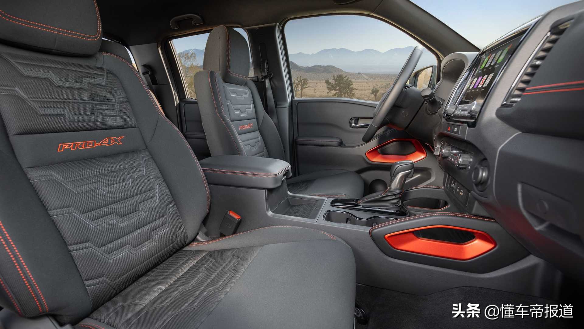 内饰部分本次并未曝光,参考新一代Frontier Pro-4X车型来看,其中控台标配8英寸多媒体显示屏,高配车型尺寸可达9英寸。此外,日产还为该车在中控台缝线和门板等细节点缀有熔岩红装饰。日产表示,全新Frontier中央扶手箱容积可达4升,前后门板储物槽容积也分别达到了6.5升和5.7升。