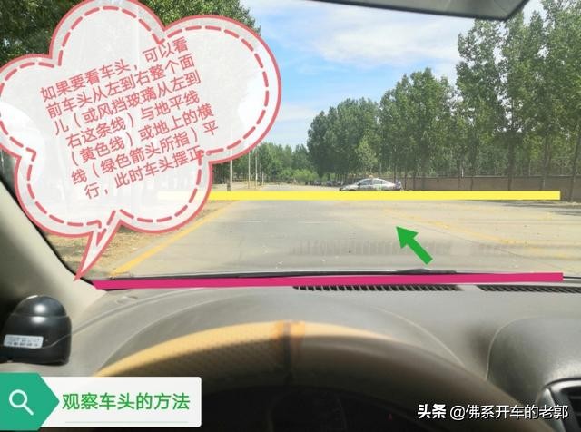 在车辆转到想要去的道路上以后,可以观察车头从左到右整个面,最好看风挡玻璃下边沿从左到右的一条线(参见下图),当这条线与地平线平行时就代表车头已经摆正。
