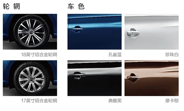 新车低配车型采用的是225/60 R17尺寸的轮胎,高配车型采用225/55 R18尺寸的轮胎,都搭配铝合金轮圈,但轮圈样式也有不同。在车身颜色方面,新车带有孔雀蓝、珍珠白、典雅黑和摩卡棕四种颜色供消费者选择。