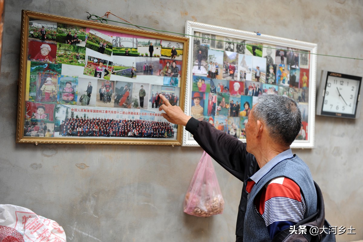 “我有一儿一女,女儿出嫁了,儿子结婚后也搬到了新村。我和老伴留恋这个地方,加上种地也方便,就没有搬。”老张说,他是个退伍军人,1975年在四川当的兵,1979年复员,之后就一直在这个家里居住、生活,虽然住的是窑洞,交通也不是很方便,但习惯了,也没觉得有啥不好的地方。图为老张指着镜框里的一张照片,介绍他和战友们退伍40年时聚会的合影。