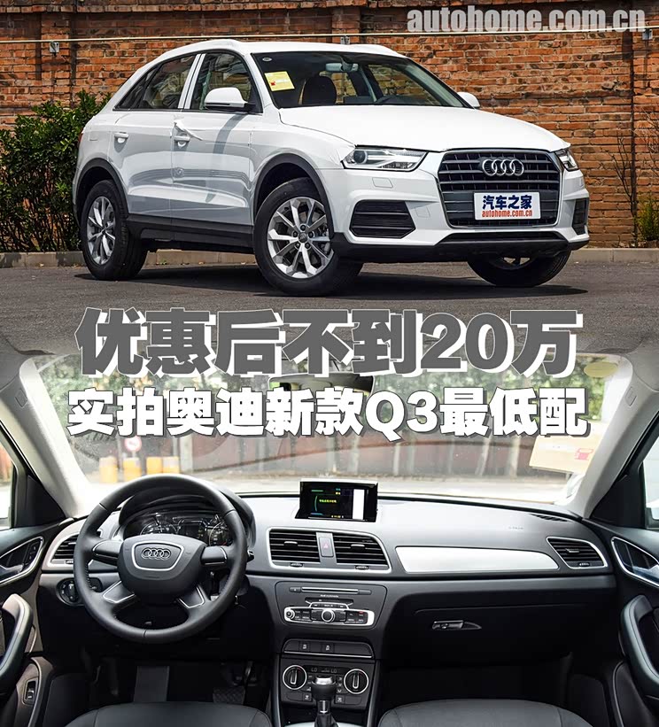 新车图解 2016年北京车展上奥迪新款Q3正式上市,这是Q3上市以后的首次中期改款,主要在车头和尾灯做了细微调整。新车上市以后,配置最低的入门车型的售价由之前的24.98万进一步下探到23.42万元,尽管距离其上市时间还不到两个月,但目前该车在经销商处已经有了一定程度的降价,以上海的行情为例,现在最低配的车型可以有大约4.5万元的降价幅度,也就是说不到20万元就可以购得。