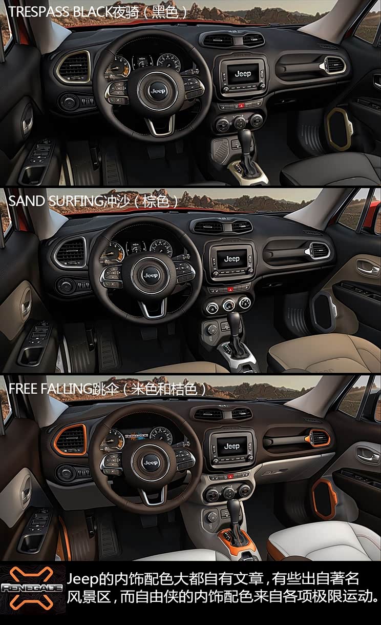 自由侠内饰设计保留了Jeep的粗犷风格,同时有一些时尚元素值得玩味,小型SUV车还是需要这样的年轻设计。