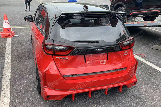 外观方面,新车整体延续飞度普通版车型的设计,配备有更具战斗气息的前唇、侧裙以及夸张的尾部扩散器。此次拍摄到的车型是采用了红黑撞色设计,车尾还配有大尺寸尾翼。新车的熏黑轮圈与红色卡钳相搭配,也更突出年轻运动的氛围。