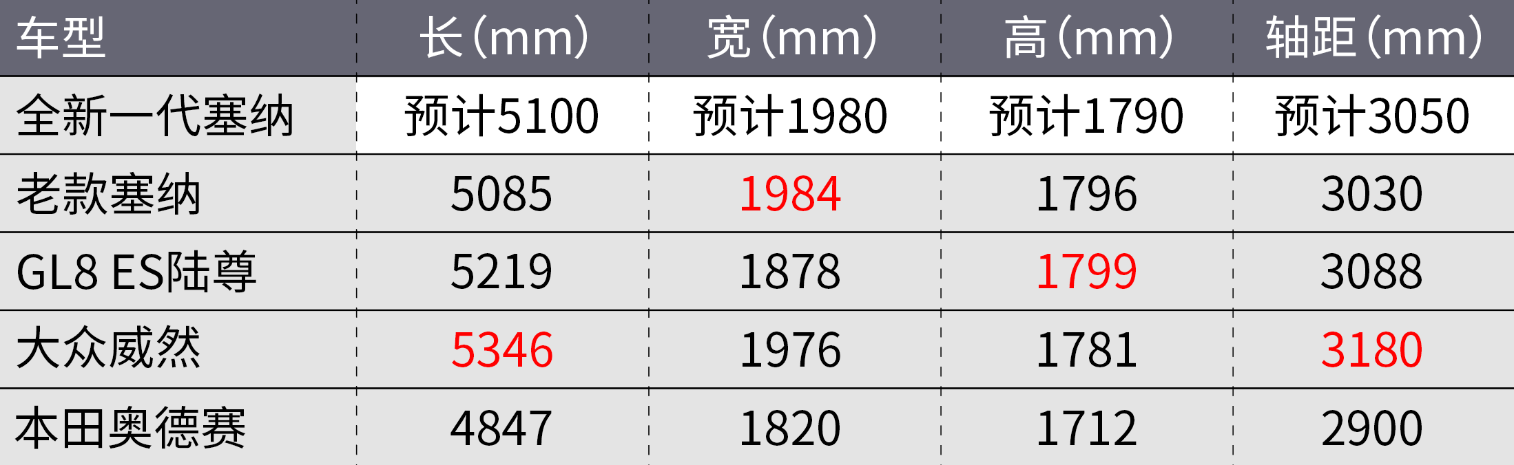 从级别来看,国产塞纳的级别是要高于本田奥德赛的,虽然目前官方并未公布全新一代塞纳的尺寸,但是根据上一代车型推测,全新塞纳的三维尺寸会与GL8看齐,车长超过5米,宽度超过1.9米,轴距也会有所增加。但是按照TNGA架构偏向驾驶和行驶稳定性的风格,全新塞纳的车身高度有可能会略低一些。