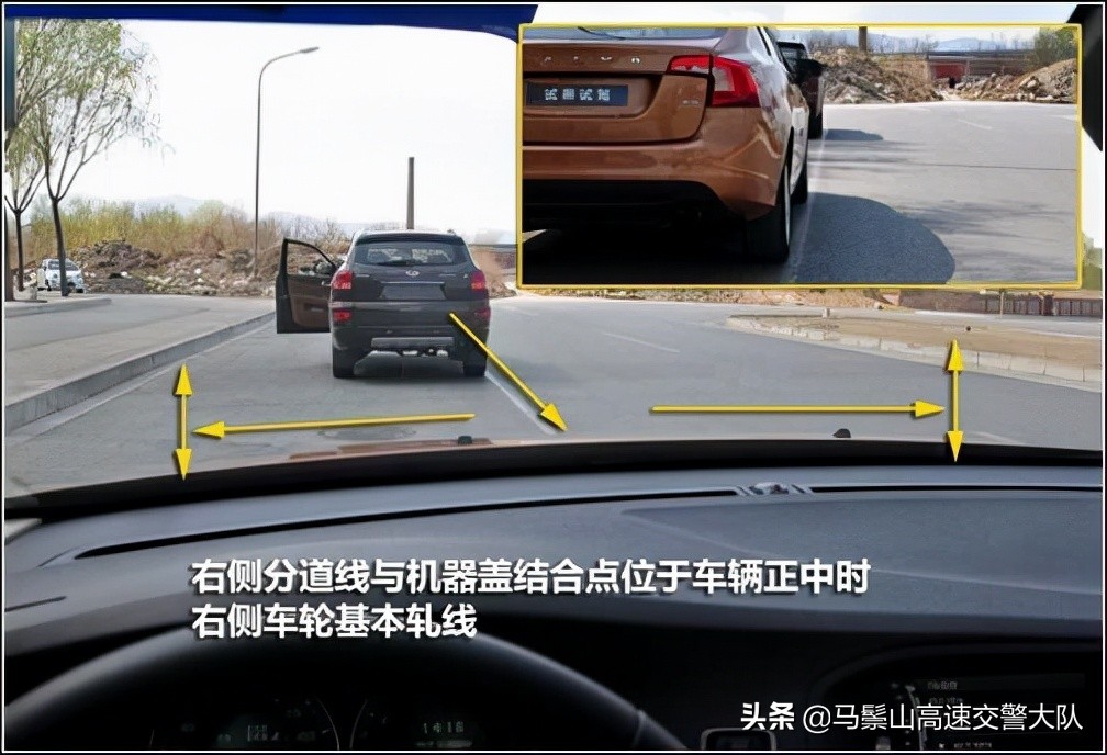 因为驾驶员位置在左侧,所以判断右侧车轮位置的方法与左侧稍有不同。如下图当右侧的车道白线与机器盖中央位置重合时车辆就基本压线了。