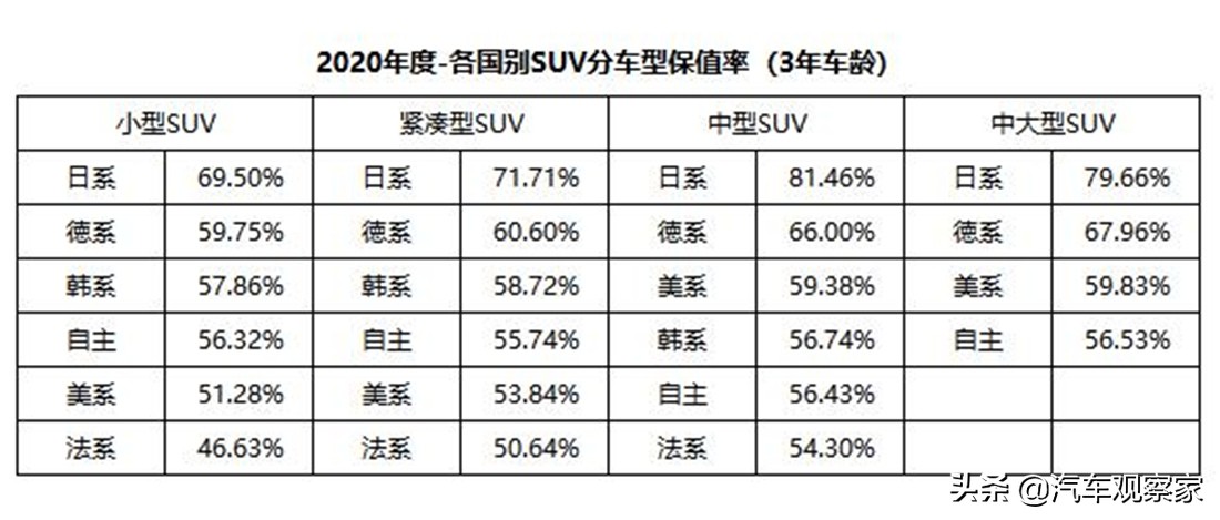 保值率有两种,一种是我们看到的榜单上指标性保值率。国内的汽车圈每年都会发布《中国汽车保值率排行榜》,2020年在不同国别车系保值率排行榜当中,日系平均保值率比德系保值率高出了5个百分点。有人说保值率只看国籍,不谈论具体车型,就是耍流氓。那就再来看看《2020年中国汽车保值率排行版》,小型车前十名里有7款是日系车;紧凑型车前十名里日系车也有7款;中型车里日系前十名中有5款;中大型车里有3款。SUV的保值率排行榜中 ,小型SUV日系有3款;紧凑型车有7款;中型车有5款;中大型车有4款。可见日系车的保值率是多么的不可小觑。