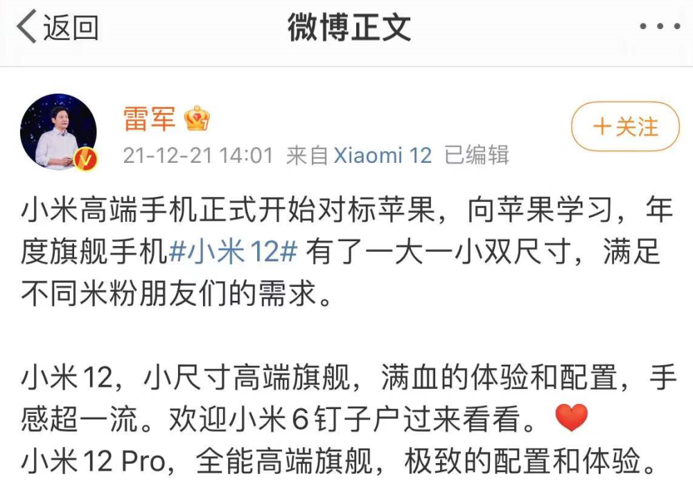 雷军在微博中也直言:小米高端手机正式开始对标苹果,向苹果学习,小米12如今有了一大一小两个尺寸,其中小米12定位小尺寸高端旗舰机,主打小尺寸,同时还想争取一下钉子户小米6系列用户。而小米12 Pro则是常规尺寸(6.5~6.7氛围)。