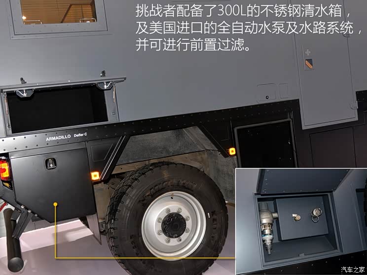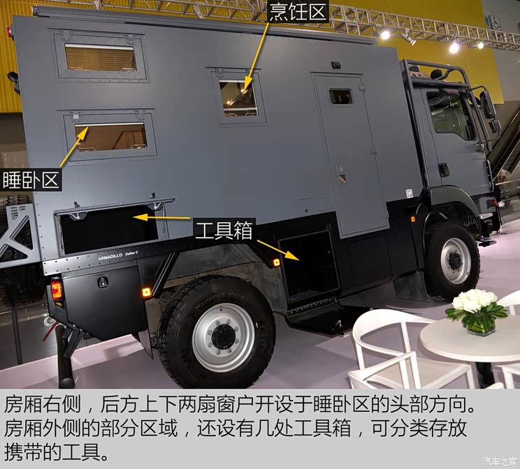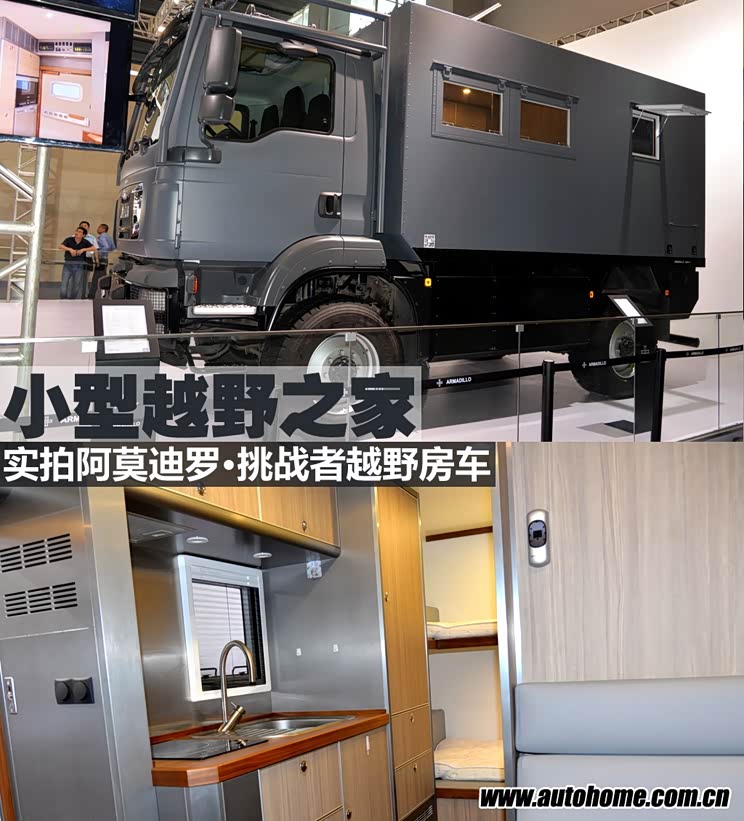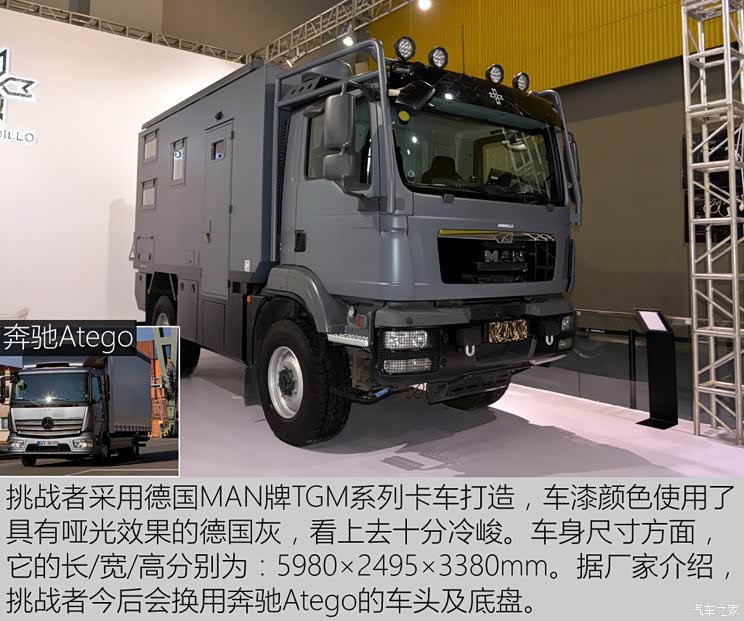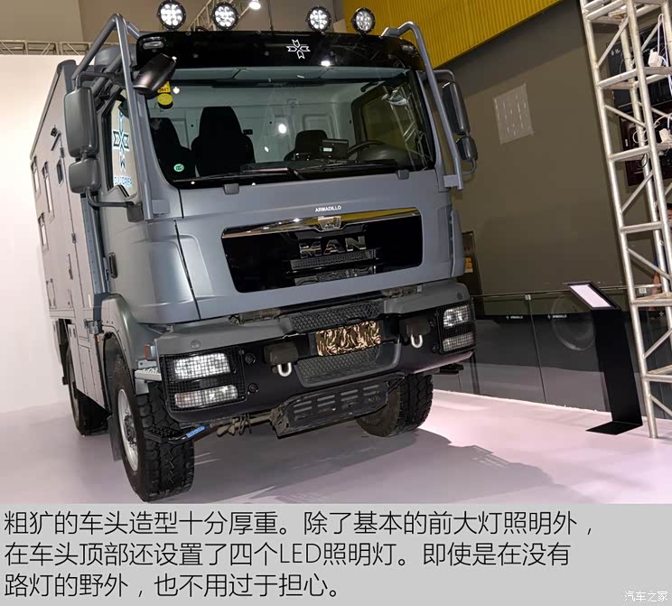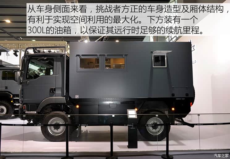 新车图解 先前,我的同事为大家介绍过一辆比较彪悍的越野型房车阿莫迪罗·远征者,其庞大魁梧的外形仍让许多人记忆犹新。不过,它九米左右的车身长度会使人觉得很难驾驭。没有关系,同样采用MAN系列车型打造的阿莫迪罗房车,还有一款小型越野式车型——阿莫迪罗·挑战者(以下简称挑战者)。与前者相比,相对较小的车身让人感觉会更好把控和停放,并且仅需C1驾照的它也让更多人有了驾驶资格。