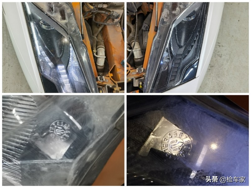 再来看左右两侧的大灯,这辆车的大灯日期是非常好看的,就在大灯上面的灯罩就能发现,日期都是11年下半年生产的,而这辆车是12年3月出厂的,所以这个灯可以判断是原厂的大灯。基本我们可以判断车辆前部的问题并不大,前保险杠拆卸的原因可能是轻微磕碰做喷漆修复或者其他原因。