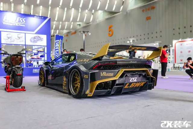 中置引擎的超跑玩宽体,尺寸自然是非常夸张,超大号的尾翼跟扩散器,在灰金配色之下杀气又多了几分,让周围一众超跑瞬间变成配角。