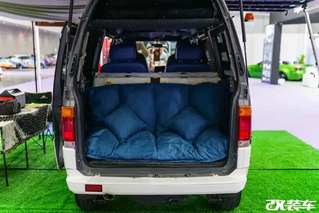 尾门大开摆出一套柔软的座垫,走累了上去就是一个葛优躺,悠闲自得的风格在展馆里真是独一份的存在。