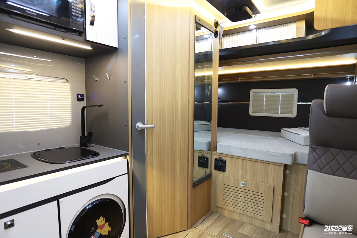 经过实测,厨房区域的主台面尺寸可以达到58x95(cm),内嵌电磁炉及赛特福得带盖洗手池,为迎合车内偏日系的生活氛围,水龙头和盖板进行了黑化处理。主台面右侧可拓展一张35x50(cm)的置物台,进一步扩大了厨房操作面积,同时也会提升用户参与感。