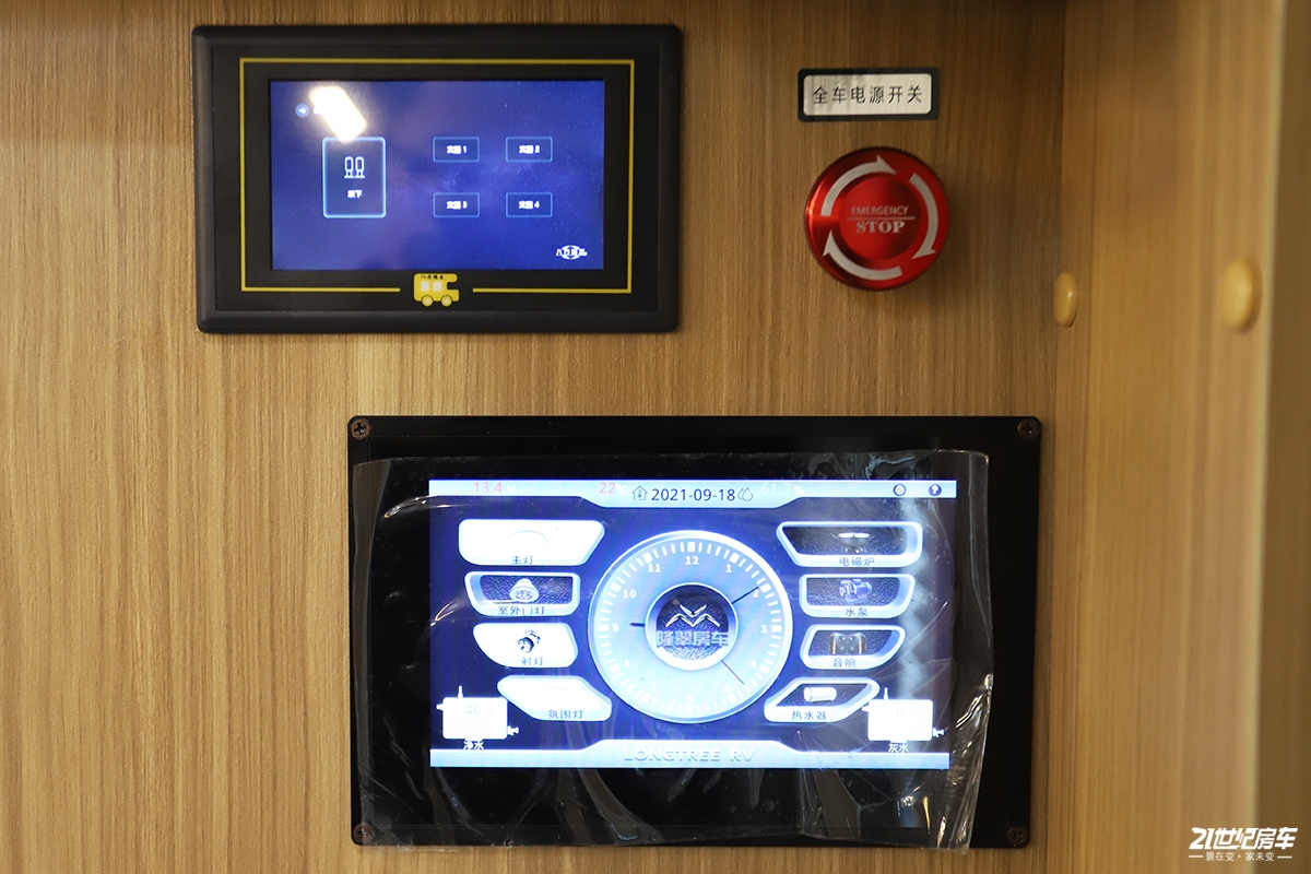 整车的信息显示、总控区域在生活区右侧,图片所示的分别是电动支腿控制屏幕、车辆信息显示及总电源开关,有意思的是电源开关包装成了类似性能车启停按钮,实际操作为旋转方式,使用方便而且旋转质感也不错。