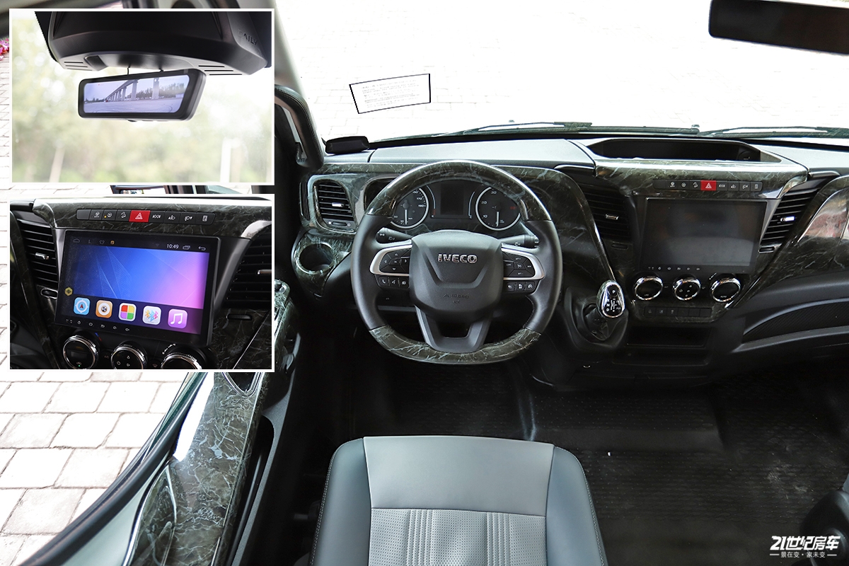 车门上方装配了富士通变频空调,外部覆盖了与内饰相同的浅木质板材,外挂的屏幕被用作6路监控显示器。