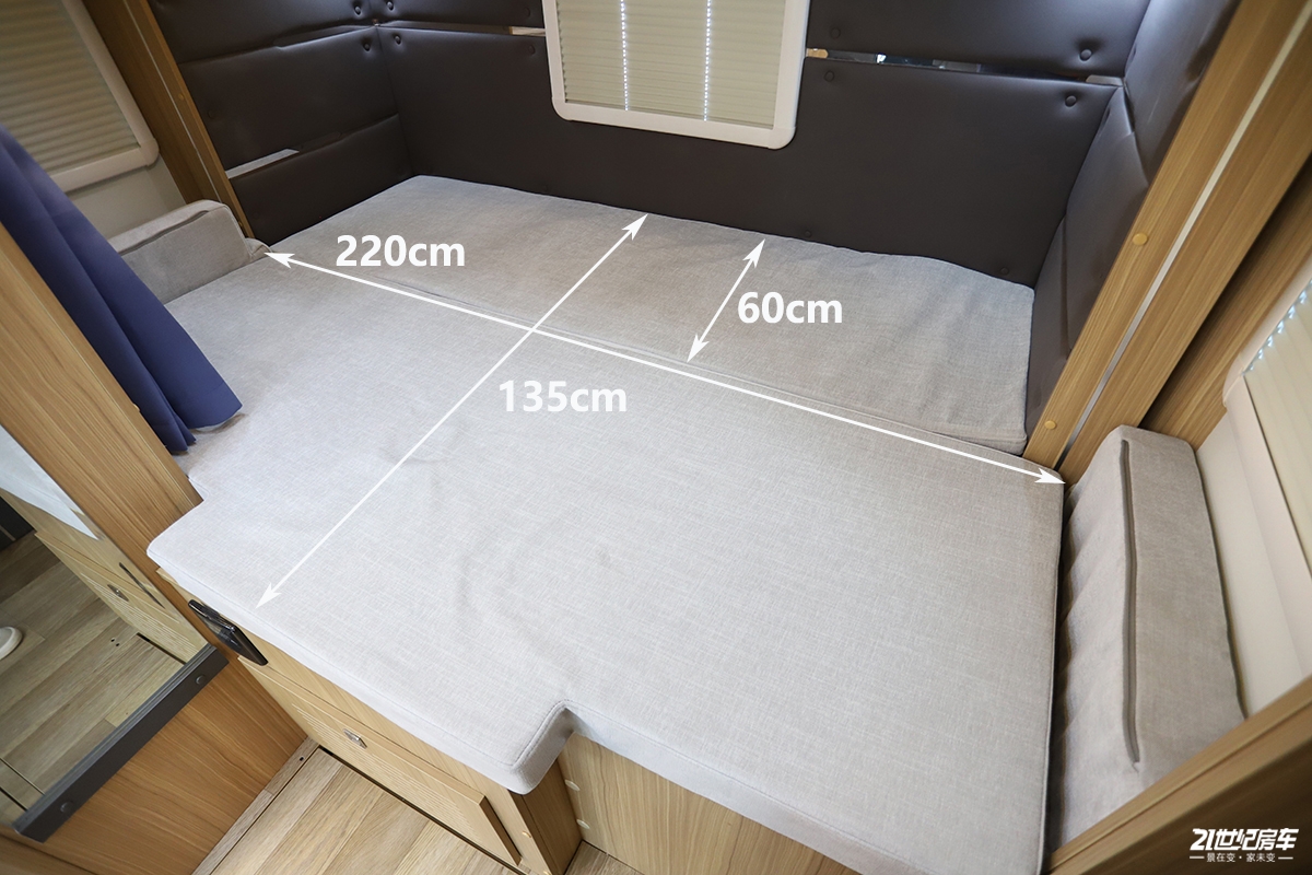 最后我们来看看后置横床区域,经过实测床铺尺寸可以达到220x140(cm),拓展舱可延伸约60cm宽度。