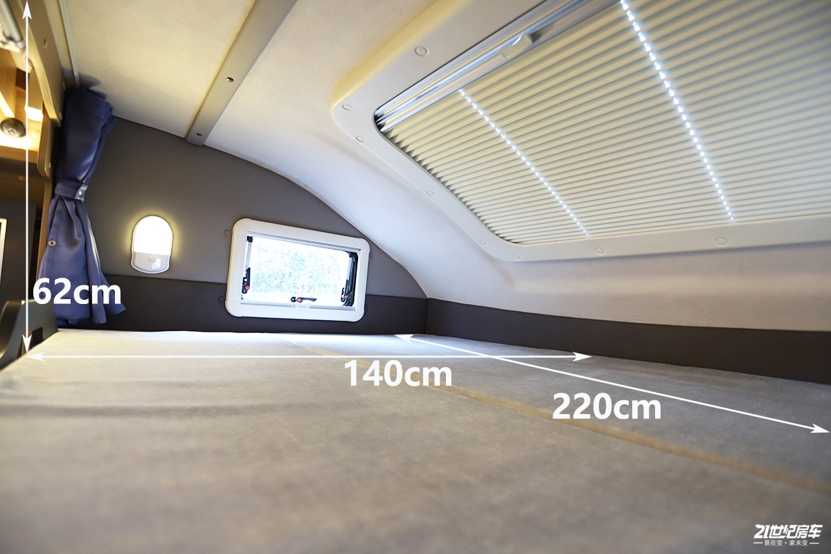 额头床的实测尺寸为140x220(cm),可供两名成年人休息。床铺距离顶部的高度为62cm,与常规高度70-75cm相比,云游双拓的额头床可能无法完全直起腰,不过抽拉式额头床收起后驾驶室头部空间空旷不会产生压抑感。