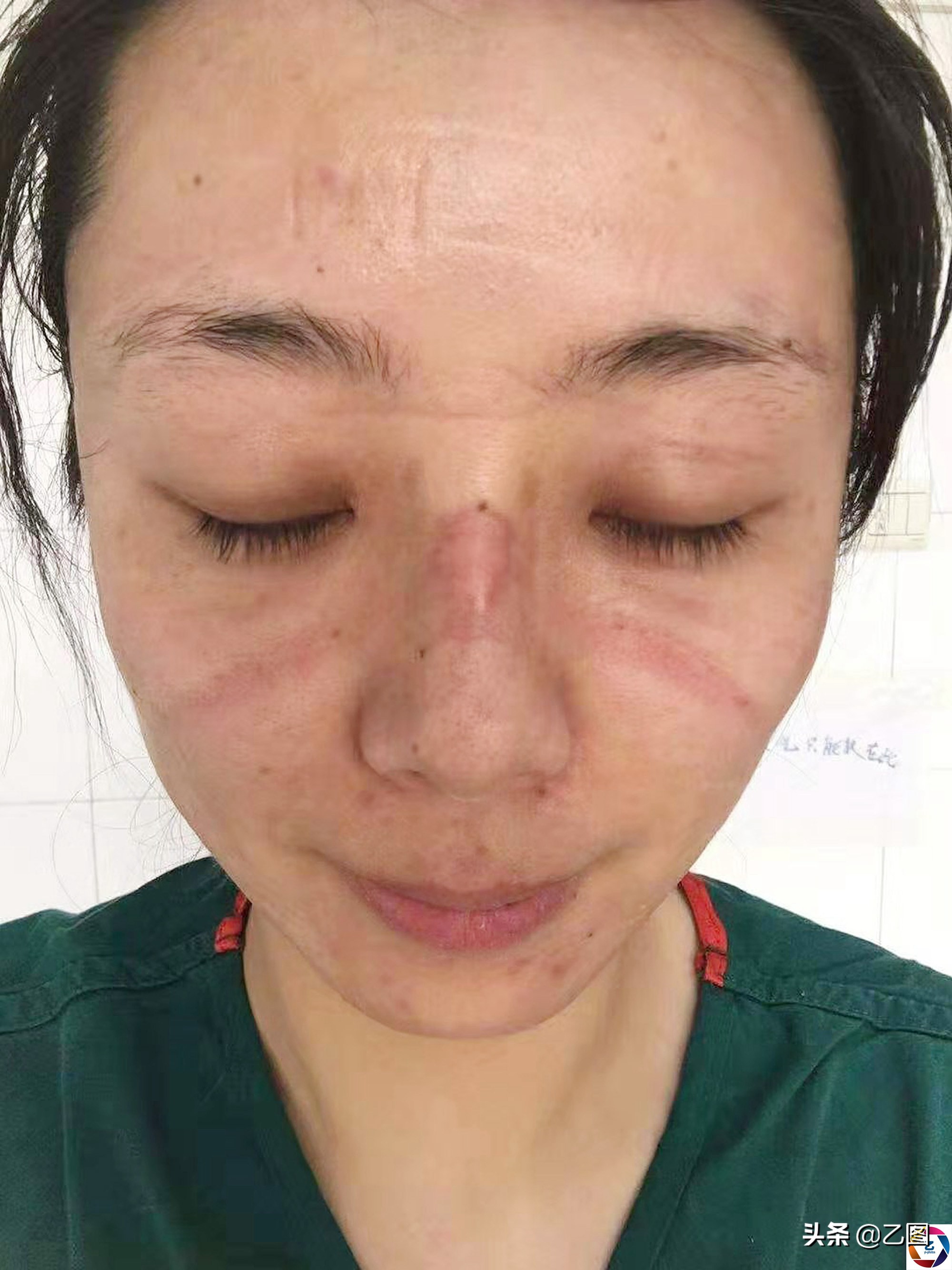 2020.1.31(大年初七):早上科室群里发了同事下了班过后的照片,这是我们科室的鲍露露老师,平时的她,很精致,皮肤超级好。我们大多数人上过班之后都是这种状况,甚至有同事鼻梁被压出水泡,我们并没有抱怨,只是出来消毒,然后休息好,调整状态,准备下个班次的工作。因为,还有病人在等着我们。图为脱去防护服和面罩后的鲍露露老师。