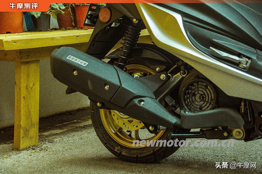 从整体外观轮廓上还是能隐约看到雅马哈劲战四代的影子,因为踏板车型基本上是由塑料饰板来装饰,饰板的质感直接决定了整车的外观。整体饰板的配色以纯黑为主基调,搭配黄金色的装饰板、轮毂和后扶手。可以看到厂家在积极地向年轻化的用户群体靠拢,至于是否喜欢就要看个人审美,这里不再延展讨论。