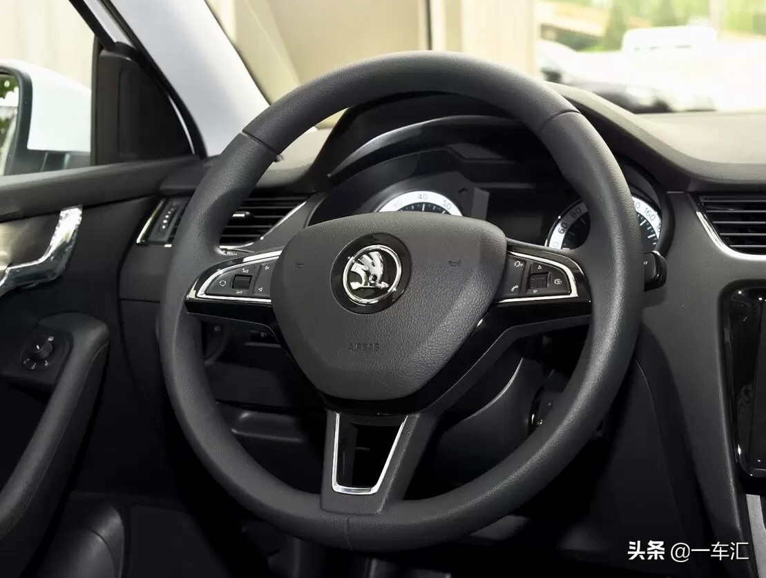 三辐式多功能方向盘换成斯柯达最新家族样式,两侧按键负责行车电脑、蓝牙语音、多媒体调节等功能,定速巡航控制则集成在后方灯光拨杆上;握柄处为塑料材质,方向盘支持手动四向调节。仪表盘为传统机械指针式表盘,搭配中间单色行车电脑显示屏,表底蓝白相间的配色,为斯柯达经典样式,中间屏幕能够显示较为丰富的行车信息;车型还配备了疲劳驾驶提示功能。