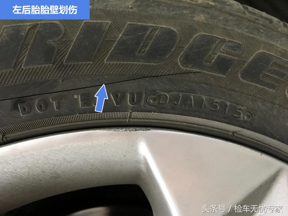 左后胎胎壁划伤,从安全角度考虑建议更换新胎。