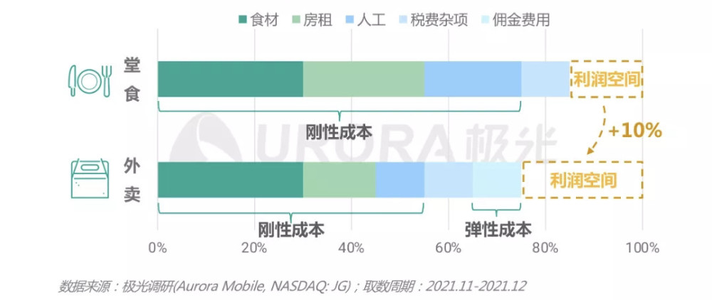 这也是国内餐饮开始重视对外卖业务投入的原因,相比较堂食的成本结构,外卖业务的成本更灵活一些。从报告的图中可看,外卖的刚性成本如房租和人力支出等可得到压缩,而多出的包装材料、外卖佣金(技术服务费)这两项弹性支出,都只有在发生交易时产生。因此,外卖整体的利润空间相较于堂食能够获得10%左右的提升。