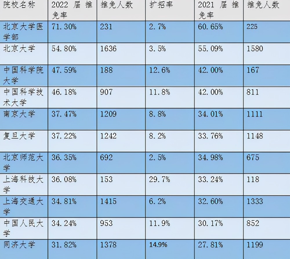 在部分已经公开的院校保研率排名汇总中,其实就可以发现很多高校的保研率是在逐年上升的,在22年这一届多数都超过了30%,其中北大本部和北大医学院更是达到了50%和70%以上。